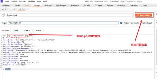 抓取访问a.php的数据包,打开BP的监听功能,在浏览器中访问/upload/a.php