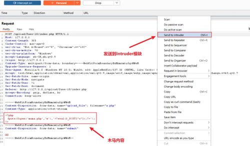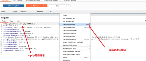 在BP中打开监听功能,抓取上传文件的数据包。右键单击空白处,选择Send to Intruder,将数据包发送到攻击模块。