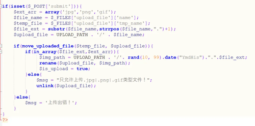 • if(in_array($file_ext,$ext_arr))判断上传文件的后缀是否在白名单中。如果在,则继续向下执行进行文件保存。