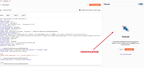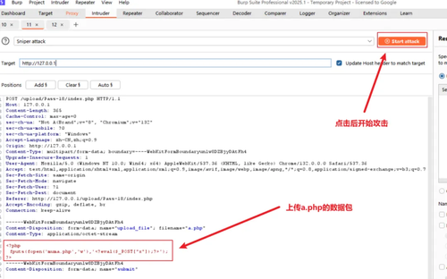 在上传a.php的数据包页面点击Start attack,向服务器不断提交a.php文件