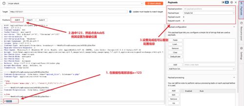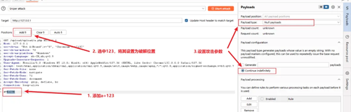 • 在数据包尾部添加a=123(这个内容随意,主要是用于配置攻击选项)